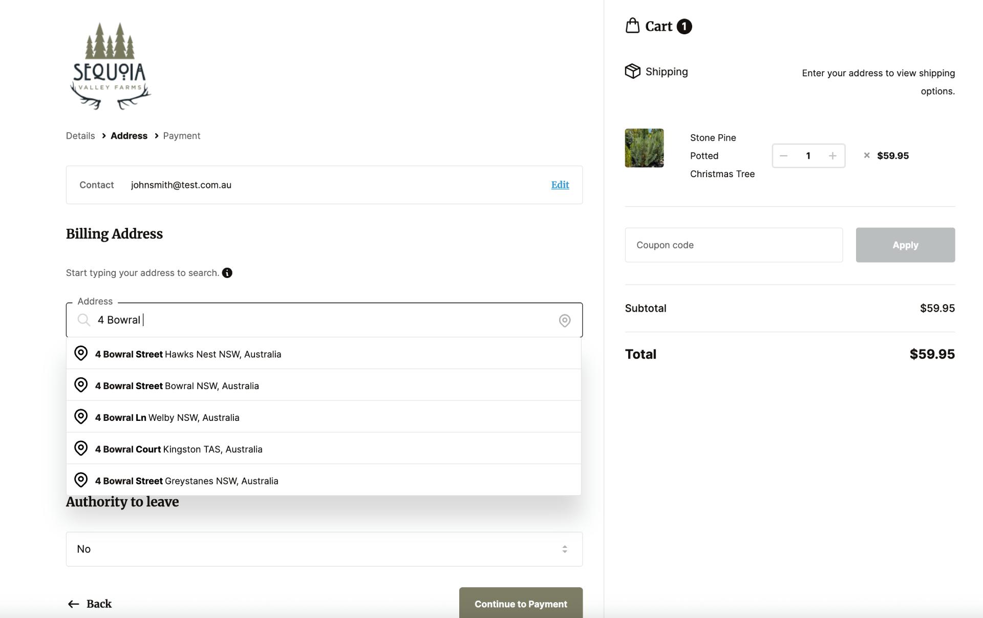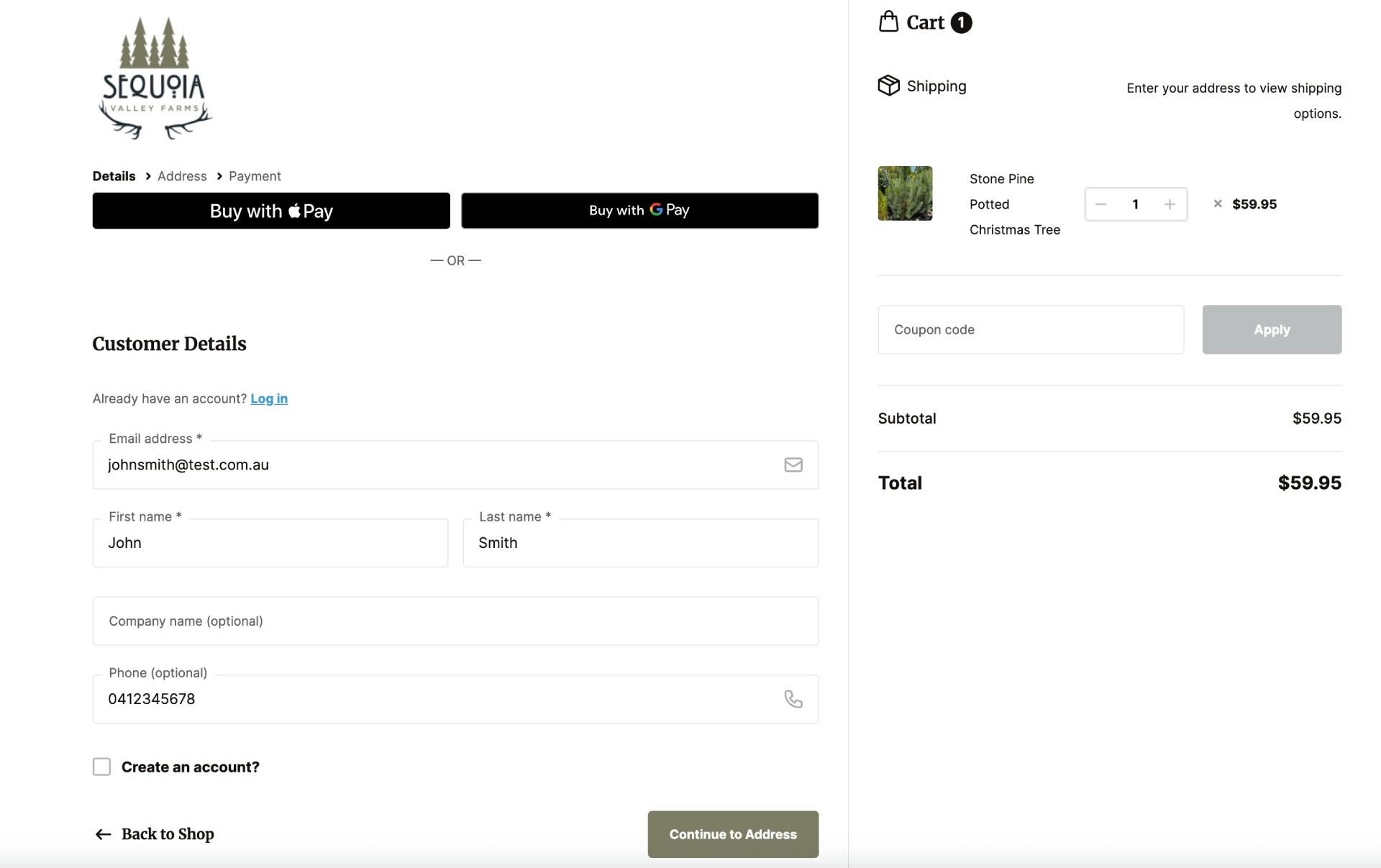 Once you've added your tree to the cart, select 'checkout'. You'll enter our new, clean, multi-step checkout process designed to make your shopping experience better.