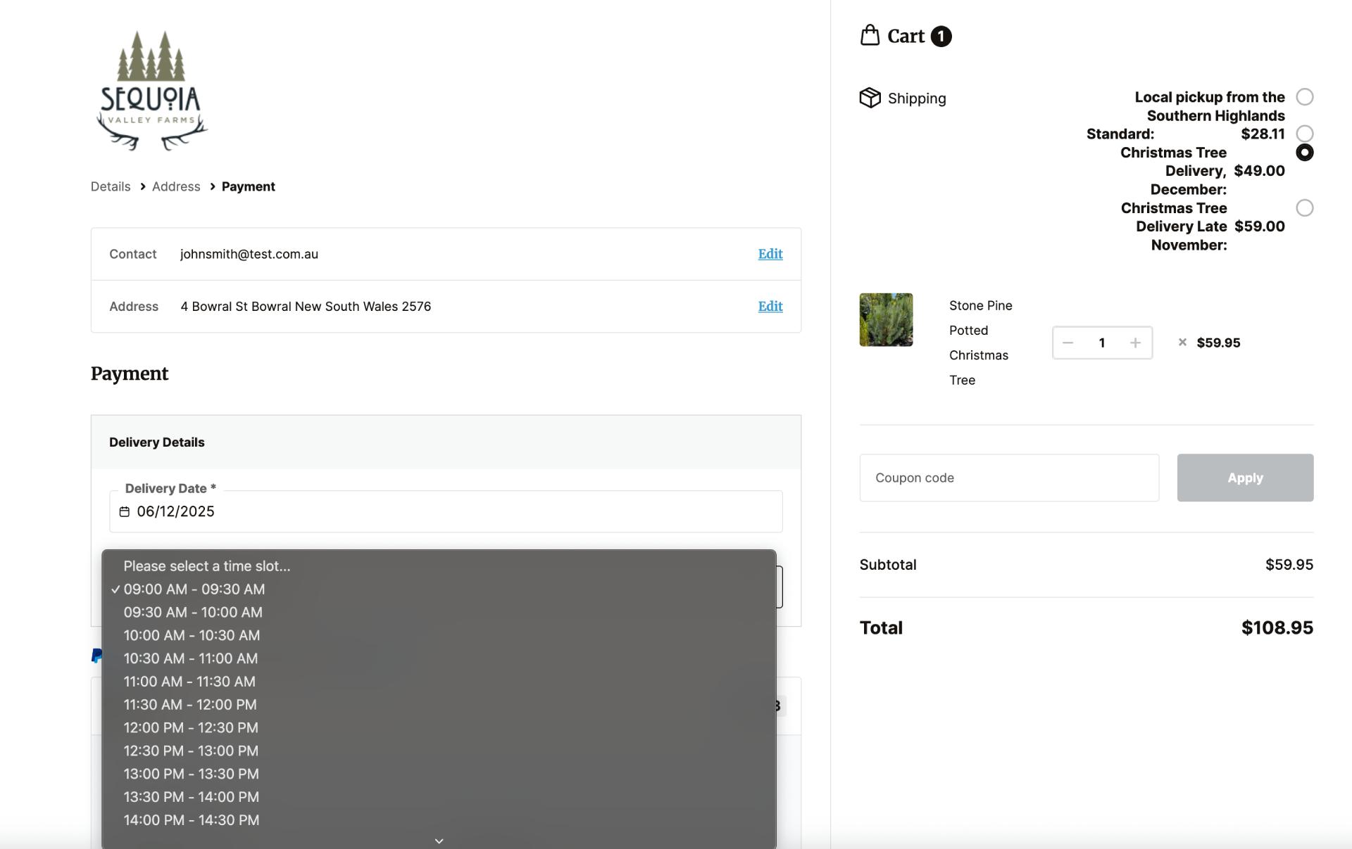 A: Our free Local Pickup is available at our Mittagong base in the beautiful Southern Highlands. Our Delivery Slots plugin will allow you to book a specific 30-minute time slot on the available collection days.