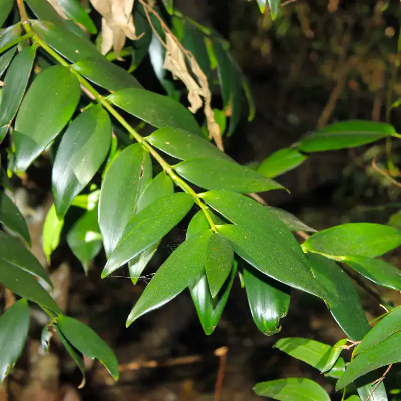 The most striking feature of the Kauri Pine is its incredibly straight, smooth trunk, which appears almost completely cylindrical and lacks lower branching in maturity. The bark is a beautiful mottled grey and brown, gently flaking away. The foliage is thick, leathery, and dark, glossy green, arranged in opposite pairs. It produces distinct, spherical to egg-shaped seed cones that disintegrate on the tree to release winged seeds.
